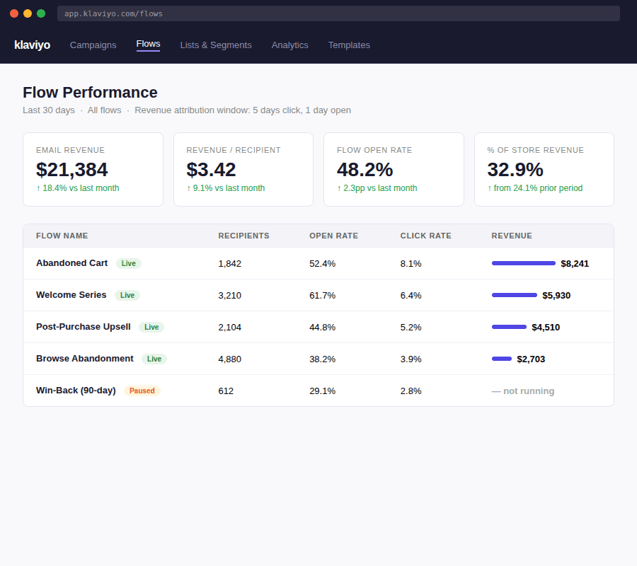 Here's a representative Klaviyo flows dashboard for a DTC health & beauty brand doing $65k/month in revenue. Email is generating 32% of total store revenue — almost entirely from automated flows running in the background.
