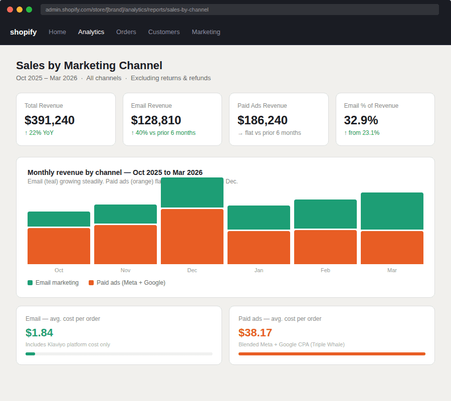 What does this funnel look like in Shopify's analytics when you cut by channel? The chart below shows a brand that shifted their mid-funnel spend from retargeting ads to email over Q4 2025 and Q1 2026. Ad spend stayed flat. Email revenue grew 40%.