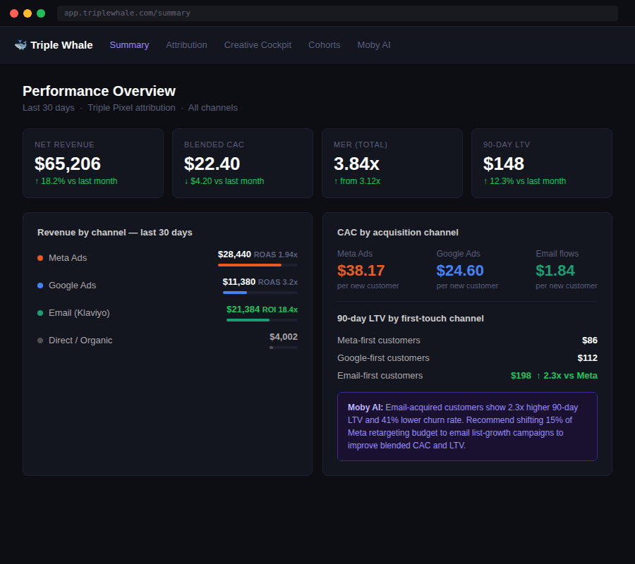 Klaviyo and Shopify tell part of the story. Triple Whale ties it together — showing true blended CAC, MER, and the LTV of customers acquired through each channel. The data below is what justifies doubling down on email: customers acquired via email flows have a 2.3x higher 90-day LTV than those acquired purely through paid ads.